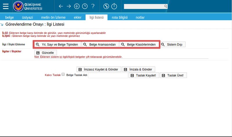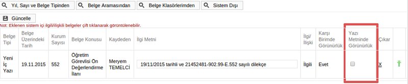 4. İlgi listesi sekmesinden ilgilinin dilekçesi ilgi olarak eklenir. İlgi yazısının metinde görünürlüğü kaldırılır. (Resim 1 - Resim 2)