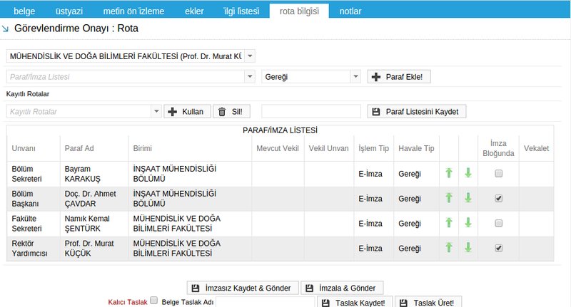 6. rota bilgisi sekmesinden ilgili fakülte/yo/myo sekreteri paraf olarak eklenir. Rota sırası şu şekilde olmalıdır:
