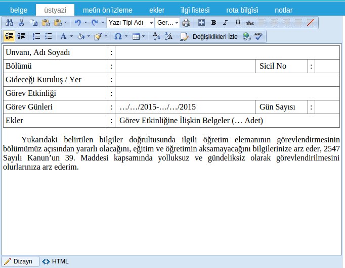 2547 Sayılı Kanunun 39. Maddesi kapsamında 7 günden az ve yolluksuz/yevmiyesiz görevlendirme talebinde bulunacak Öğretim Elamanı bağlı olduğu Bölüm Başkanlığına en az bir hafta önceden talebini EBYS'den dilekçe ile iletir.