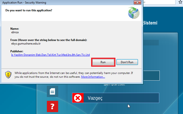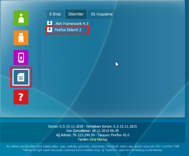 Firefox'un yeni sürümlerinde E-İmza eklentisi çalışmamakta olup Firefox 52 ESR sürümü kurulmalı ve güncellemeler kapatılmalıdır.